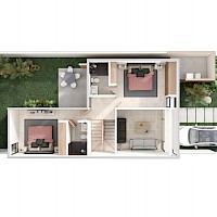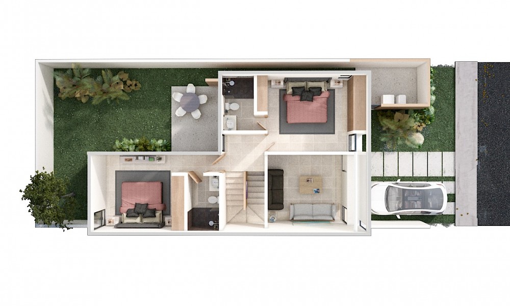 Esta propiedad se caracteriza por tener una amplia habitación en planta baja y una distribución equilibrada en dos niveles, amplios ventanales y con opción de crecimiento a futuro.