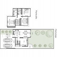 El modelo D se caracteriza por tener una sala-comedor a doble altura y tres habitaciones en planta alta.