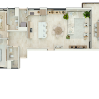 Este modelo se caracteriza por tener una amplia vista al mar desde el área social y contar con dos habitaciones cada una con baño.