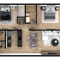 Este modelo se caracteriza por tener 2 habitaciones completas y 2 baños completos.
