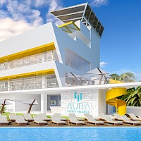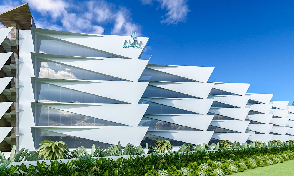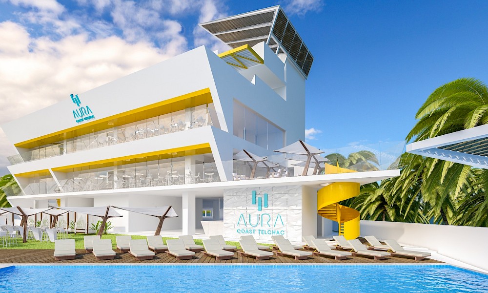 Ubicado en las playas de Telchac, a 50 minutos de la ciudad de Mérida. Aura Coast es un desarrollo conformado por 80 departamentos inteligentes distribuidos en seis niveles dentro de una privada con seguridad y amenidades, que combinan de manera integral la tecnología, arquitectura y el urbanismo a pie de playa.