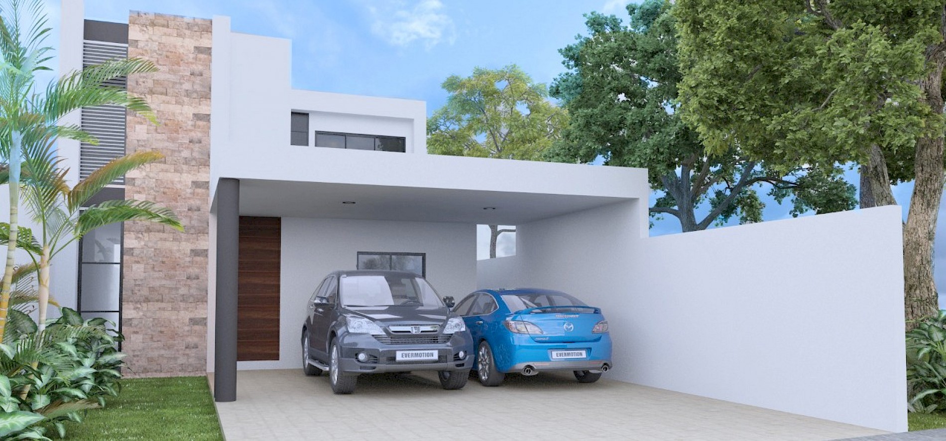 Este modelo se caracteriza por tener una habitación en planta baja y dos en el segundo nivel, además de una amplia piscina.
