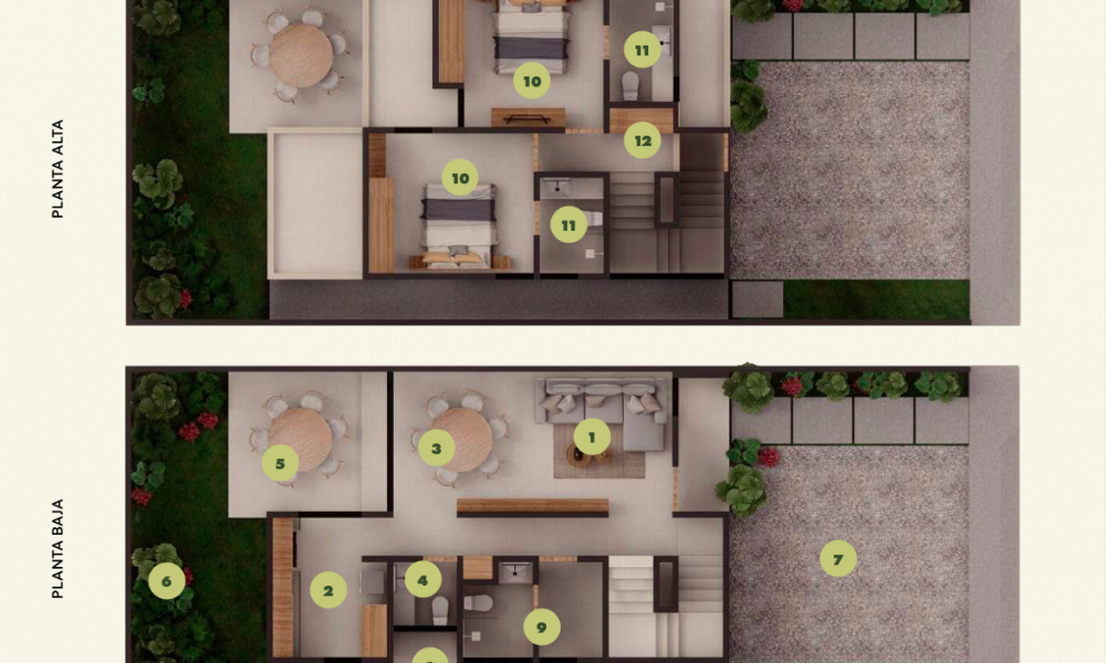 El modelo C se caracteriza por estar distribuído en dos niveles, tener una terraza techada, cuarto de servicio con baño y contar con dos habitaciones en planta alta, además de tener la opción para crecer una tercera habitación.