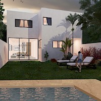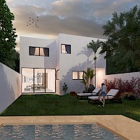 Este modelo se caracteriza por contar con tres amplias habitaciones en planta alta y una piscina en el área del jardín.