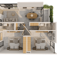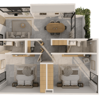 El modelo B se caracteriza por contar con dos habitaciones, una de ellas con baño propio y área de clóset.