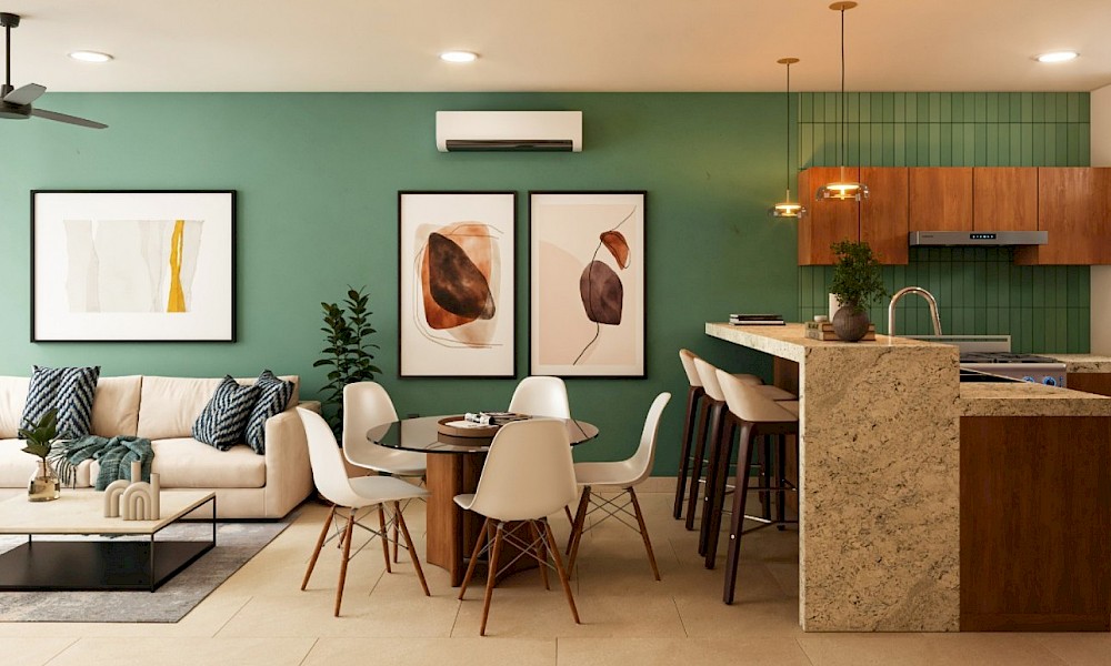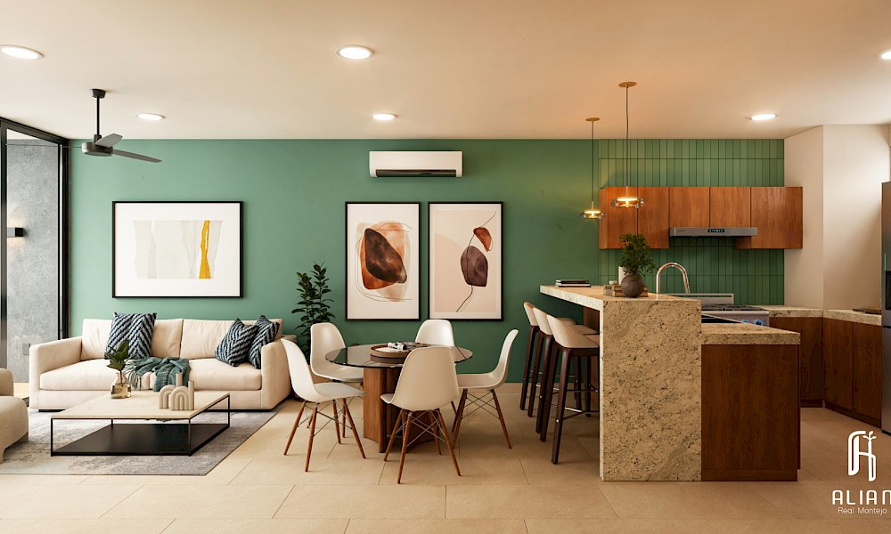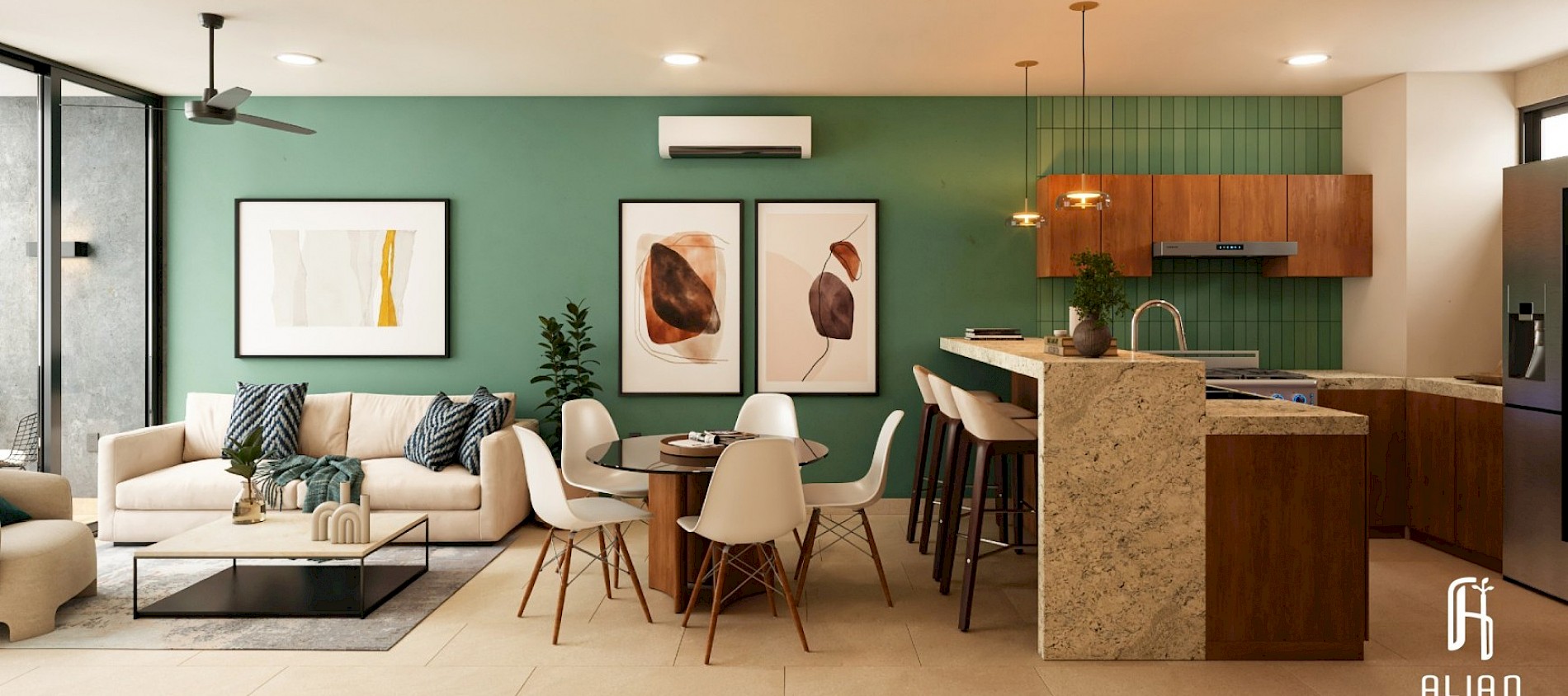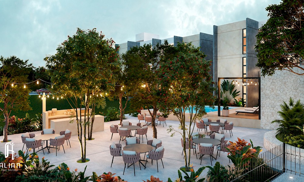 Preventa de departamentos en Alian, ubicada en el fraccionamiento Real Montejo al norte de Mérida. La zona es de un entorno campestre residencial con amplias avenidas y áreas totalmente arboladas y todos los servicios a cortas distancias.