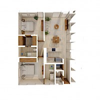 El modelo Éter se caractriza por contar con dos amplias habitaciones cada una con baño propio, además de un baño para visitas.
