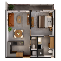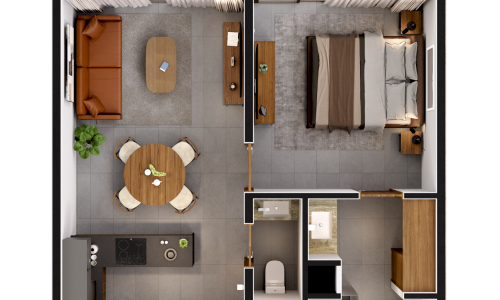Este modelo se caracteriza por tener 1 habitación con clóset vestidor y baño privado, además de un medio baño de visitas para mayor comodidad.