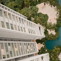 El modelo F se caracteriza por tener cuatro habitaciones cada una con baño propio, además de un espacio flex, una terraza y sala de T.V.