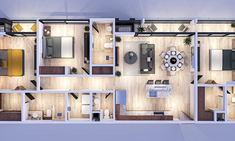 El modelo Cielo se caracteriza por contar con tres habitaciones, cada una con baño completo y medio baño para visitas.