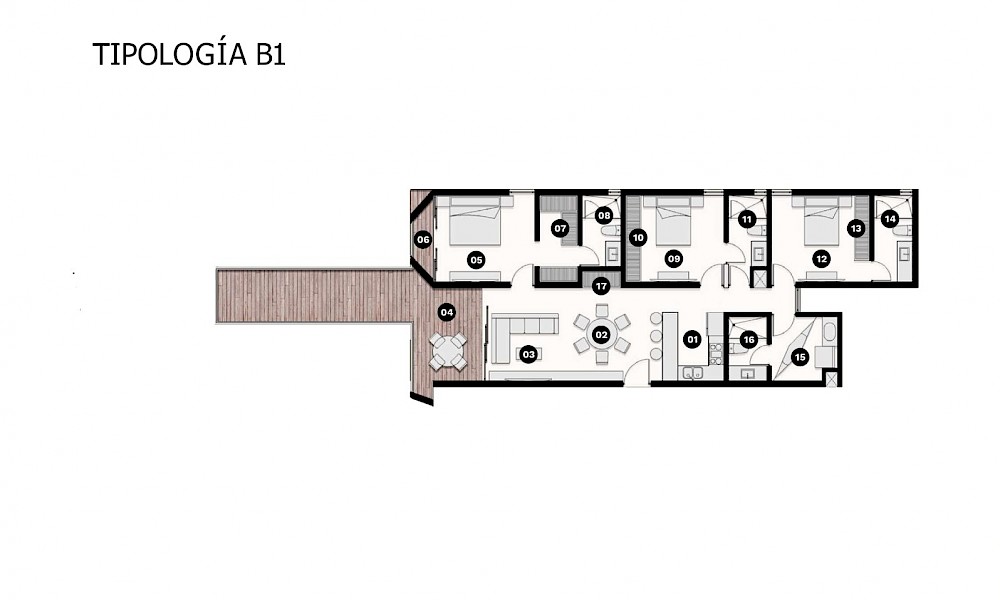 El modelo B1 se caracteriza por su amplia terraza general con un espectacular mirador, cuarto de servicio con baño y tres amplias habitaciones.