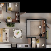 Este modelo se caracteriza por tener 2 habitaciones + un flex room, que puede utilizarse como una tercera habitación o estudio si así se desea.
