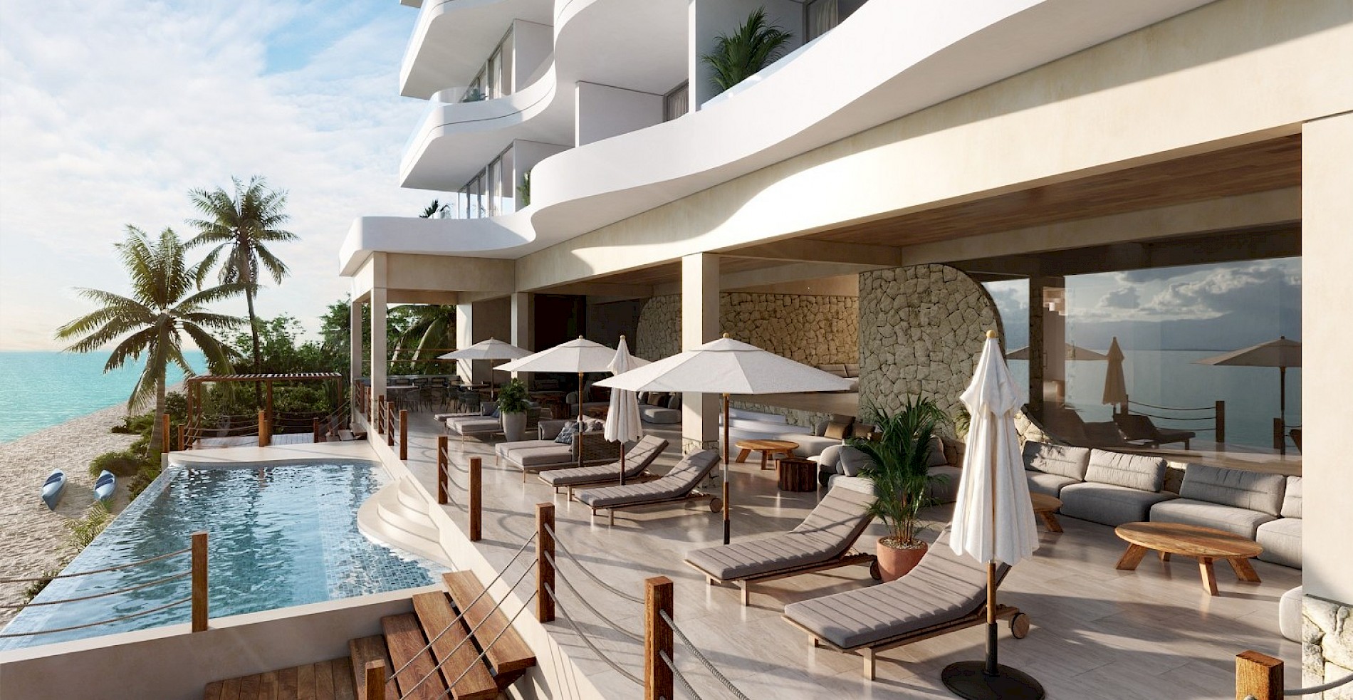 Cielo está conformado de 36 exclusivos departamentos ubicados frente al mar. Este modelo se caracteriza por contar con cuatro amplias habitaciones, la principal y dos recámaras secundarias con terraza privada con excelentes vistas.