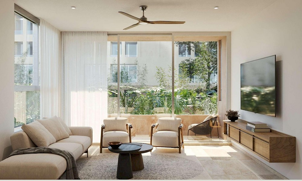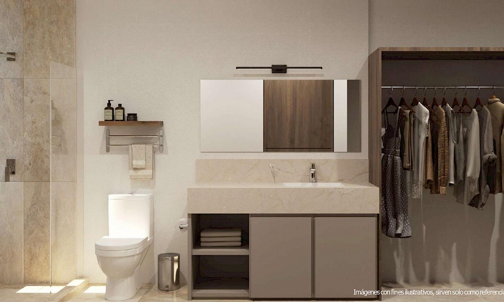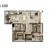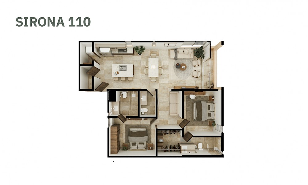 La torre Sirona estará conformada de cuatro niveles y pertenece a la primera etapa del desarrollo. El modelo 110 se caracteriza por contar con dos habitaciones y un espacio flex, además la unidad tiene la opción de poder ubicarse de planta baja y de los niveles uno al tres del edificio.