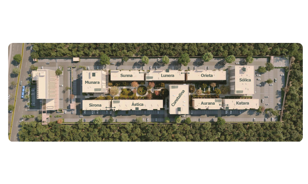 Distrito Country estará conformado de una plaza comercial, área de oficinas y 282 departamentos que estarán distribuidas en las siguientes torres: Munara, Sirona y Ástica para la primera etapa; Sunna, Lunera, Orieta y Constalina para la segunda etapa y Katara, Sólica y Aurana para la tercera etapa.