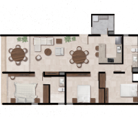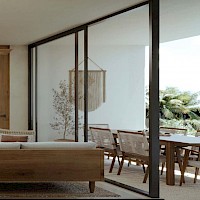 El modelo Clásico está distribuido en un nivel con tres habitaciones y un área de sala-comedor con vistas a la terraza.