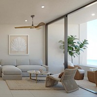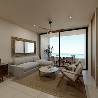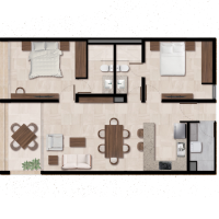 El modelo Clásico está distribuido en un nivel con dos habitaciones y un área de sala-comedor con vistas a la terraza.