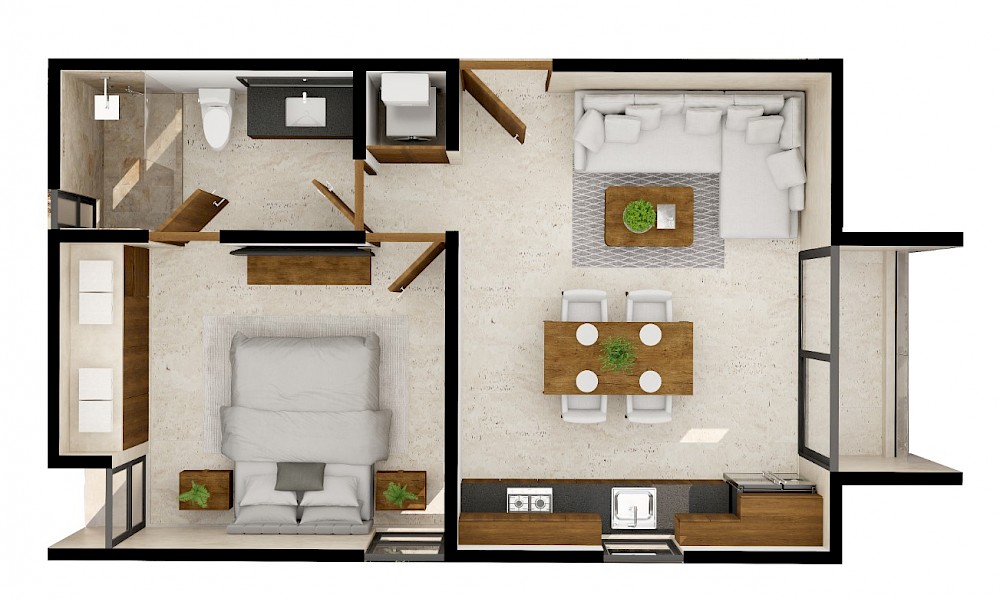 El desarrollo estará conformado de 21 departamentos divididos en cuatro niveles. El modelo Alemán se caracteriza por contar con una habitación y tener la opción de ubicarse del nivel 1 al 3 del edificio.