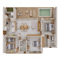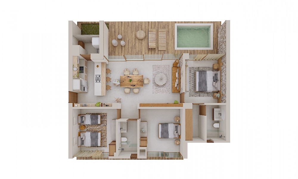 El desarrollo constará de 11 departamentos y 9 villas de lujo. Este modelo se caracteriza por contar con 3 habitaciones, piscina, ubicado en planta baja de la torre B, espacios abiertos, acabos de alta calidad, equipado con modernas comodidades y decorado con materiales locales.