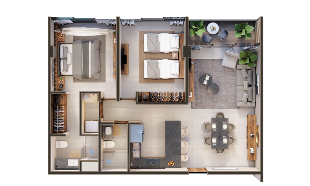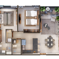 Este modelo se caracteriza por tener dos habitaciones y dos baños.