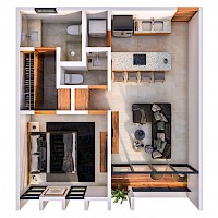 Mathea estará conformado de 74 exclusivos departamentos distribuidos en 3 niveles con variedad de amenidades y seguridad. El modelo B se caracteriza por contar con una habitación con baño propio y clóset vestidor, además de un balcón en el área de sala-comedor.