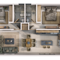 Este modelo se caracteriza por tener dos habitaciones cada una con baño propio, un medio baño en el área social, además de una armoniosa terraza que nos brindará una mayor iluminación y ventilación.