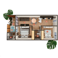 Olk´aay estará conformado de dos torres con 36 departamentos en segunda fila. El modelo C se caracteriza por contar con dos habitaciones, la principal con baño propio, con amplios espacios y una terraza de gran tamaño.