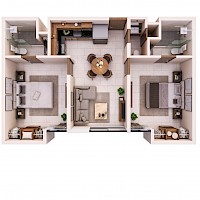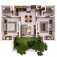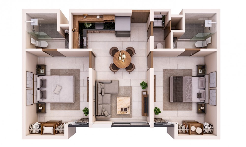 Este modelo se caracteriza por contar con dos habitaciones, cada una con baño completo y un baño exclusivo para visitas.