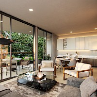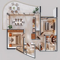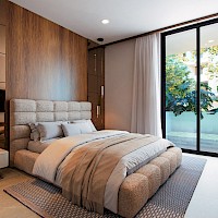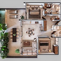 Este modelo se caracteriza por tener dos habitaciones separadas y un área social con vistas panorámicas hacia el entorno, gracias a su distribución. Cuentan con opción en planta baja y en el último nivel.