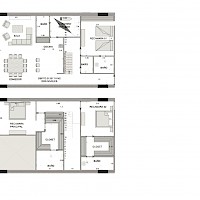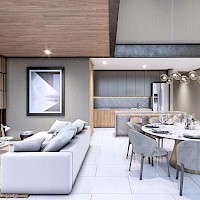 El modelo D se caracteriza por tener una distribución en dos niveles con tres amplias habitaciones, una de ellas en planta baja y cuenta con una doble altura en el área de sala-comedor, así como tener la opción de estar en los niveles seis y siete.