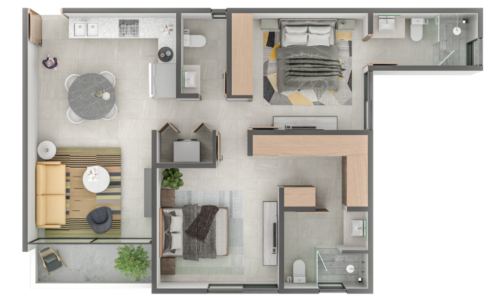 El modelo C se caracteriza por contar con dos amplias habitaciones, uan de ellas con baño y clóset vestidor.