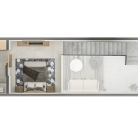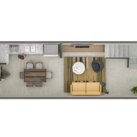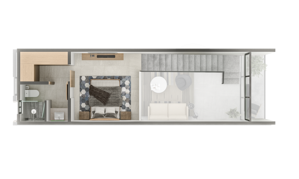 El modelo E se caracteriza por contar con una habitación en planta alta, así como un área de sala-comedor con vistas a la terraza privada.