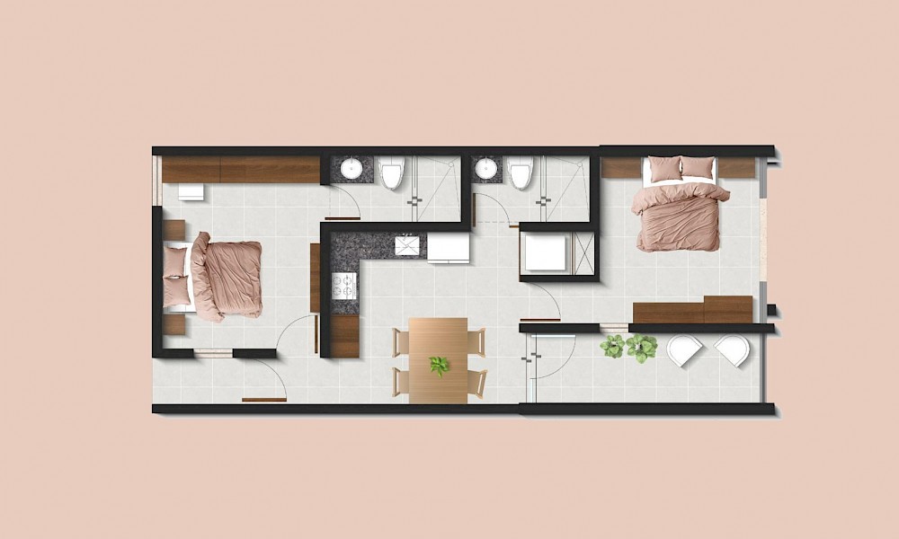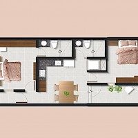 El desarrollo estará conformado de 28 unidades totales. El modelo B se caracteriza por contar con dos habitaciones y un baño completo para el área social.