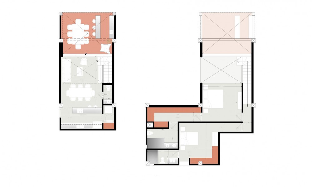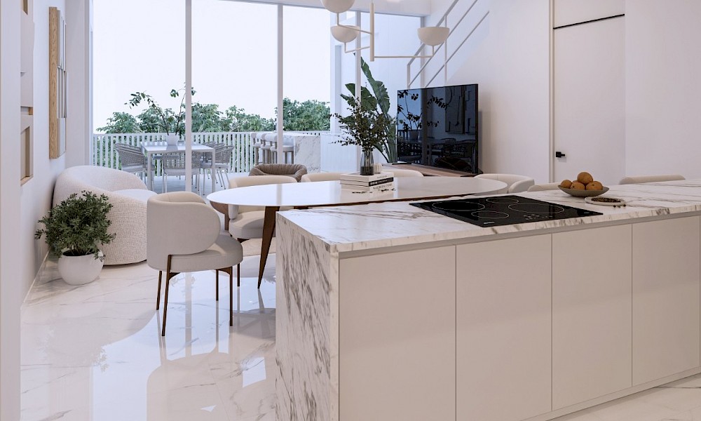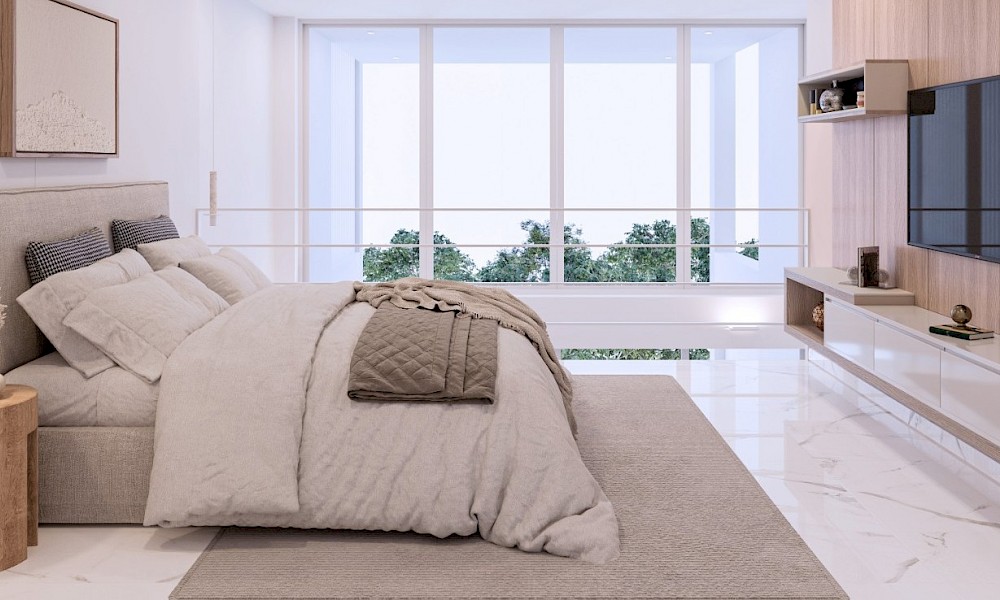 El modelo High se caracteriza por contar con dos amplias habitaciones, además de la iluminación que ofrece la sala y terraza a doble altura en conjunto con el lienzo blanco del desarrollo.