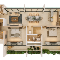 El departamento Aram se caracteriza por la distribución de sus espacios bien aprovechados con dos habitaciones, cada una con baño, clóset vestidor y balcó privado.