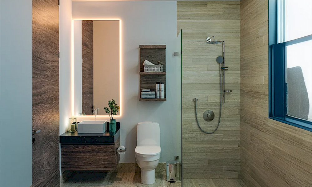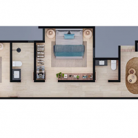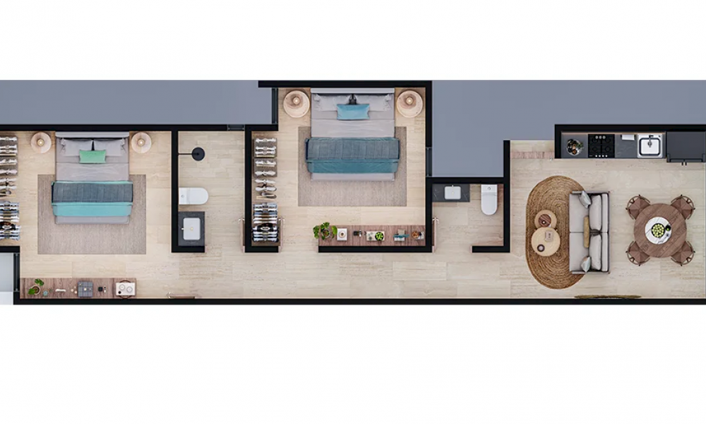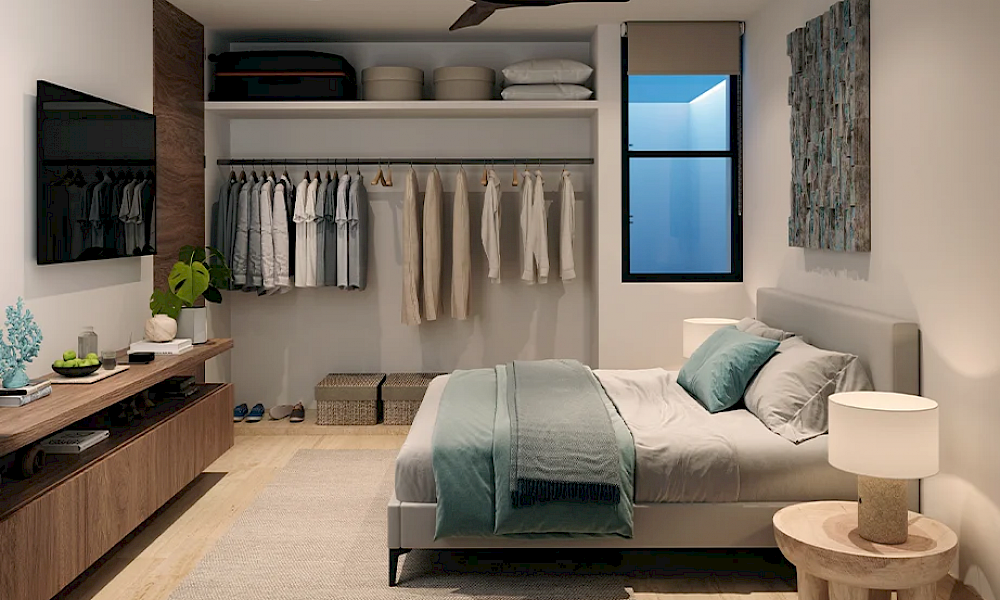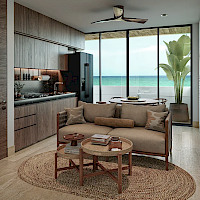 El desarrollo estará conformado únicamente 60 unidades con amenidades frente al mar con las mejores vistas de los atardeceres y aguas cristalinas propias de la zona. Este modelo se caracteriza por contar con dos habitaciones con baño compartido y un baño para las visitas.