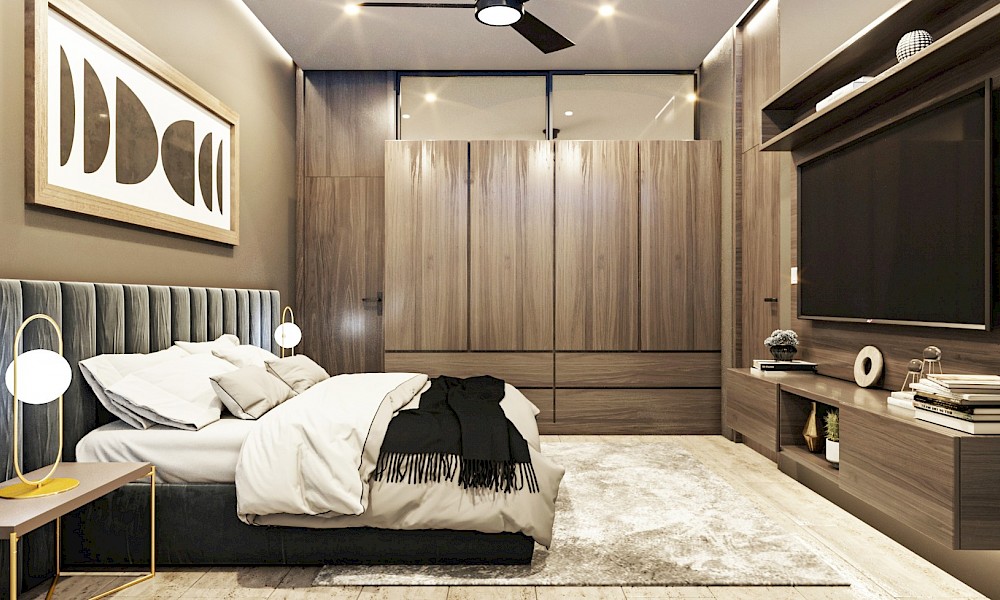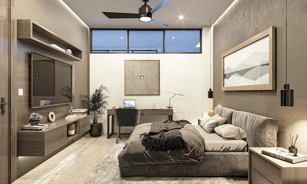 El modelo D cuenta con dos habitaciones, la principal con espacio para clóset vestidor y baño propio.