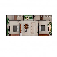 El modelo C se caracteriza por contar con dos habitaciones, una con baño propio, además de tener opción de ubicarse en cualquiera de los tres niveles de la torre.