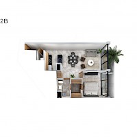 El modelo 2B se caracteriza por contar con una amplia habitación y una terraza techada, además se encuentra en el primer nivel de la torre.
