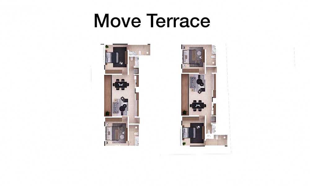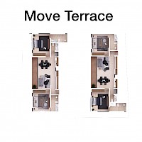El modelo Move Terrace se caracteriza por contar con dos habitaciones con baño completo y una terraza en el área de sala-comedor, además de solo encontrarse en el primer nivel de la torre.