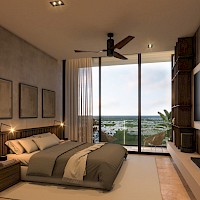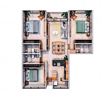 Este modelo se caracteriza por contar con una distribución armoniosa con tres habitaciones y una amplia terraza techada en el área de sala-comedor, dando un total de 127 m2, más una bodega y dos cajones de estacionamiento.