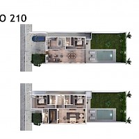 El modelo 210 se caracteriza por tener una distribución en dos plantas con cuatro habitaciones, una de ellas en planta baja para mayor comodidad.
