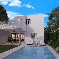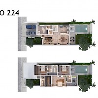 El modelo 224 se caracteriza por tener una distribución en dos plantas con tres habitaciones en planta alta, la recámara principal con balcón.