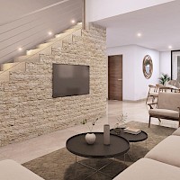 El modelo 225 se caracteriza por tener una distribución en dos plantas con cuatro amplias habitaciones, una terraza techada con vista a la piscina, además de la sala a altura y media.
