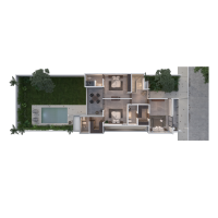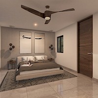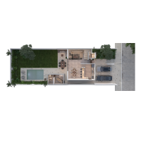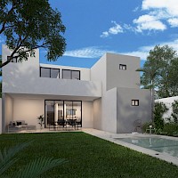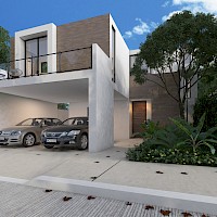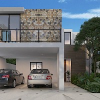 Este modelo se caracteriza por contar con tres habitaciones en planta alta, la principal con balcón y las recámaras uno y dos con terraza compartida con vista al área de jardín.