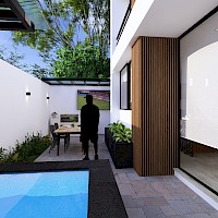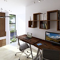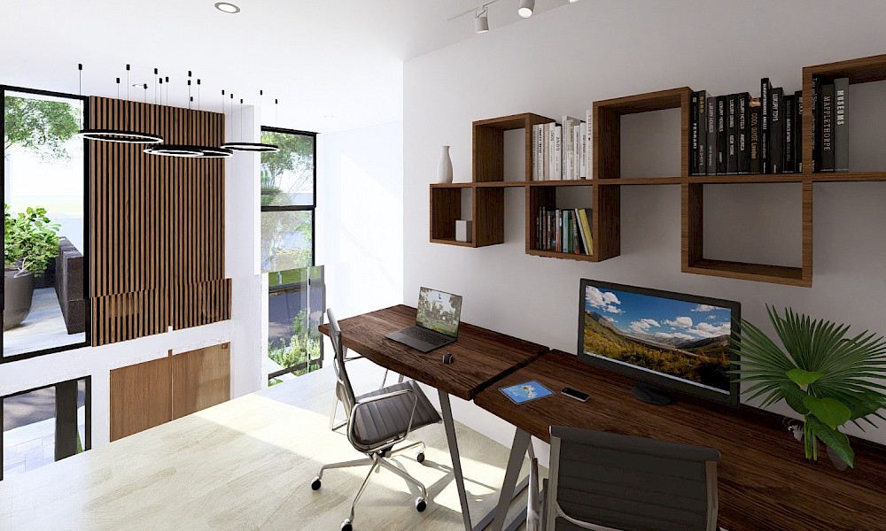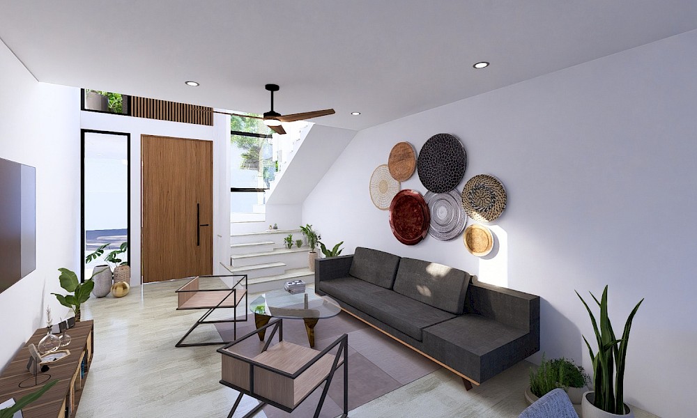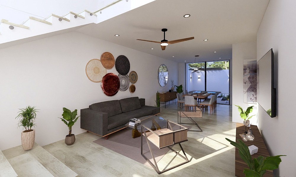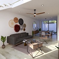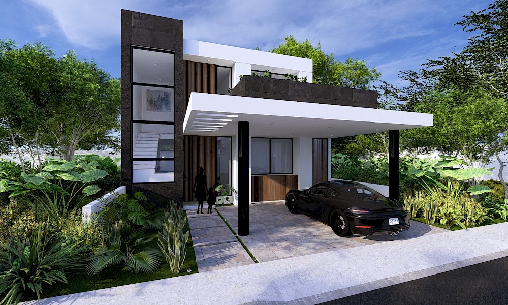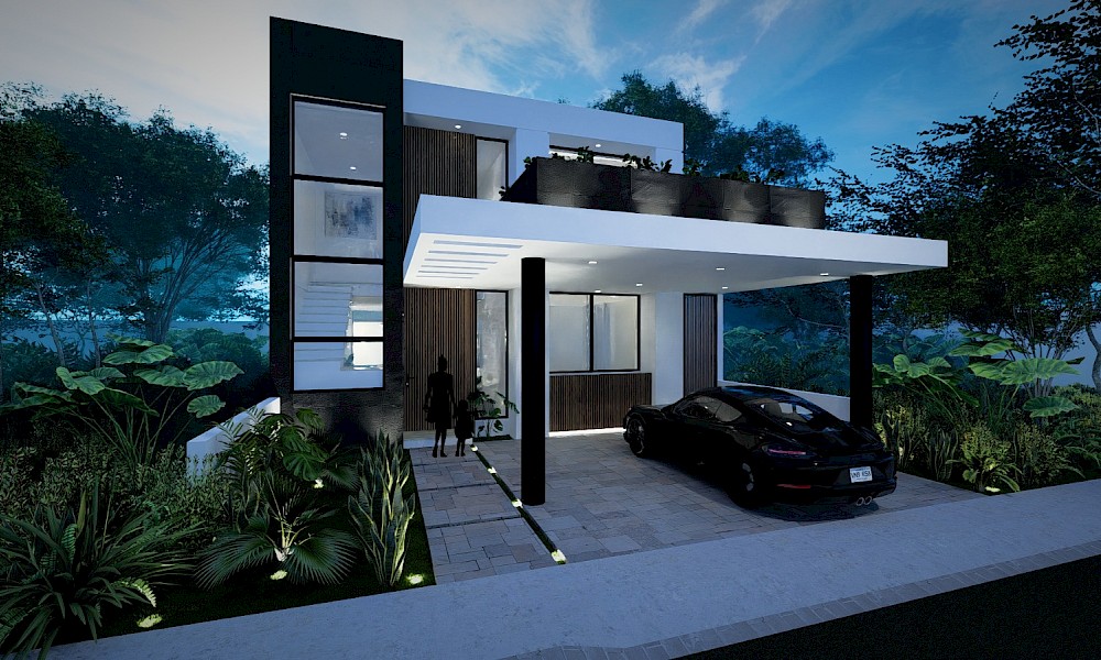 Este modelo se caracteriza por tener una sala a doble altura y tres amplias habitaciones en planta alta.