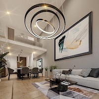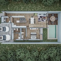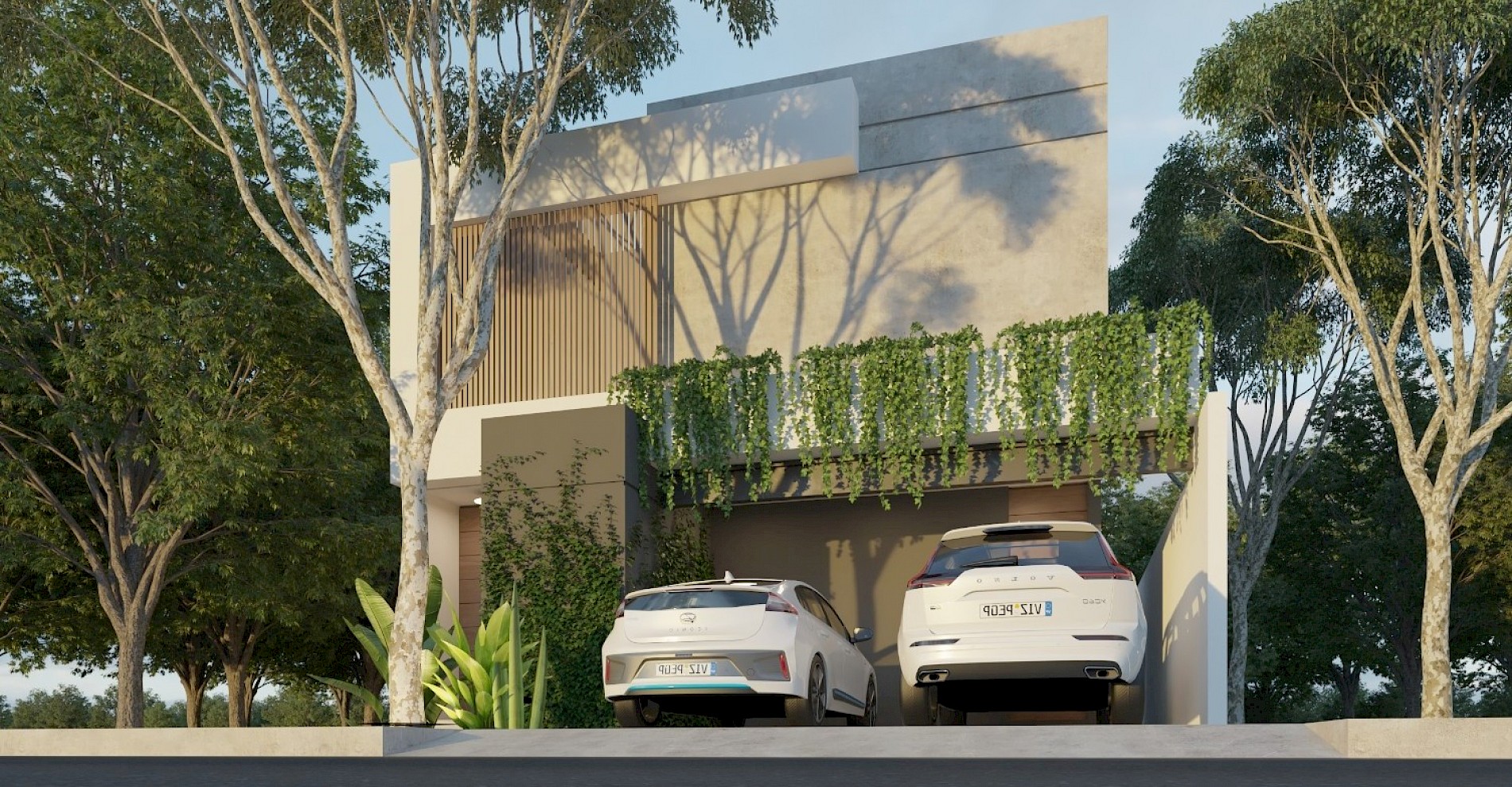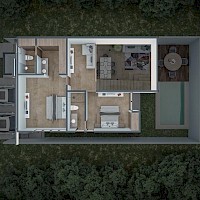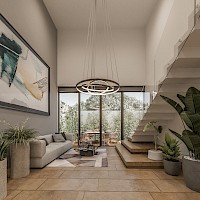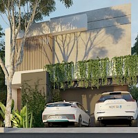 Esta opción se caracteriza por tener una habitación en planta baja, además de tener una espectacular doble altura en el área de sala-comedor.