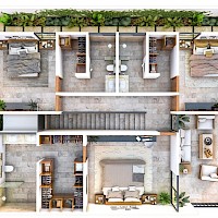 Este modelo se caracteriza por tener cuatro habitaciones, una de ellas en planta baja para mayor comodidad, además de una terraza semi techada en planta alta con una vista hermosa de la piscina.