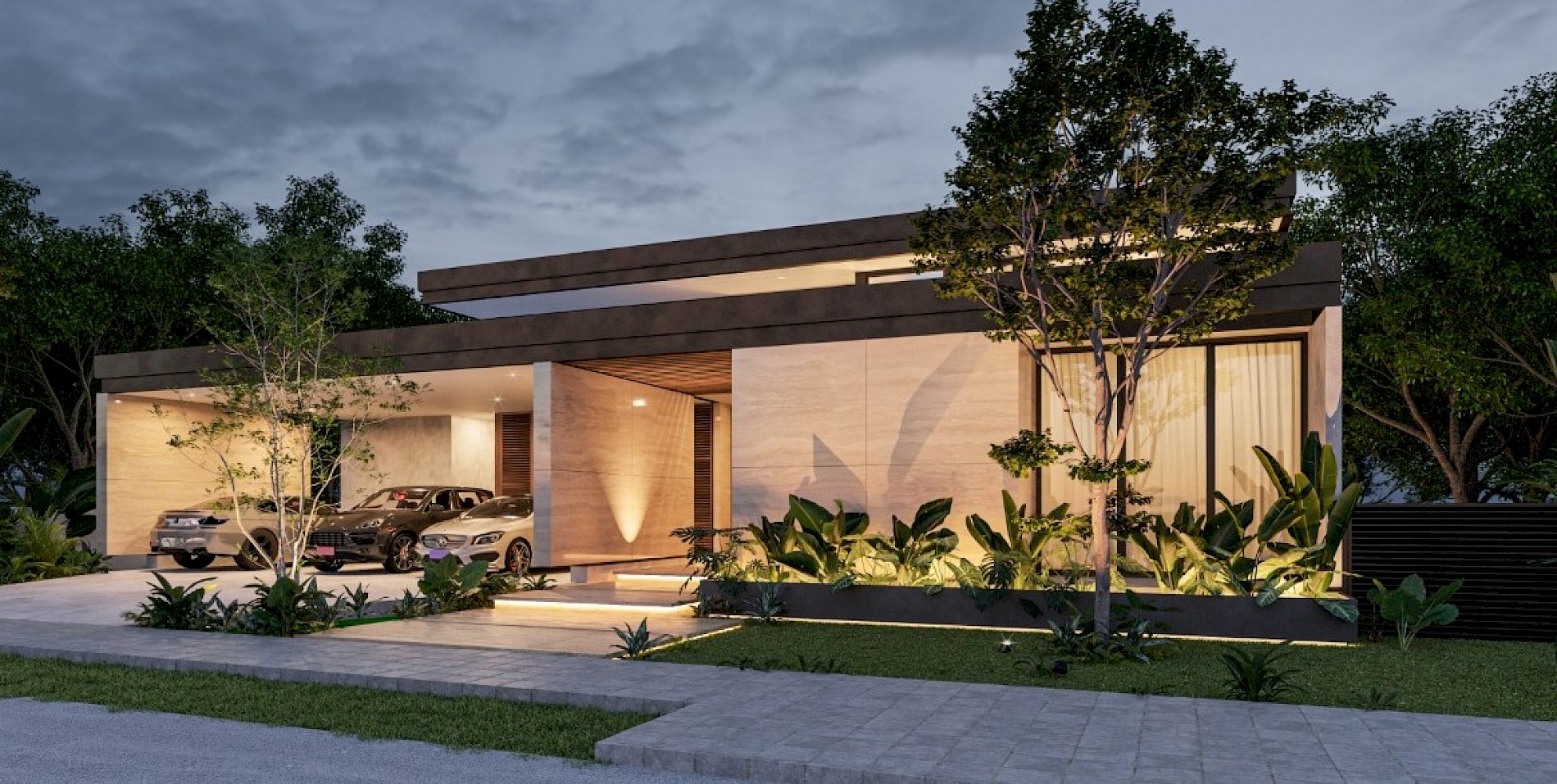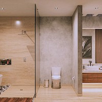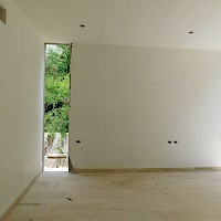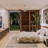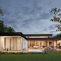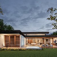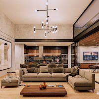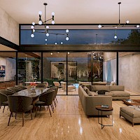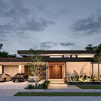El modelo 7 se caracteriza por tener un amplio terreno de 1000m2 con una distribución en una planta con cuatro habitaciones, la principal con un amplio clóset vestidor y baño con tina y terraza privada además de un área de sala-comedor a doble altura.