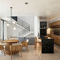 Esta propiedad se caracteriza por su diseño moderno, con espacios amplios en la zona de sala-comedor, armonizada con una doble altura y con vistas hacia el área social y de jardín; además de contar con una habitación en planta baja.